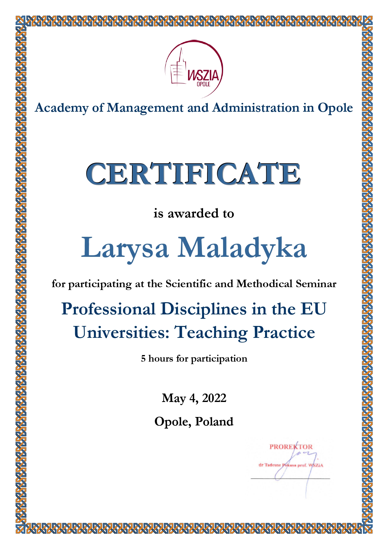 Вища технічна школа в Катовіце (WST), Республіка Польща, сертифікат «Інновації в освіті. Інноваційні технології викладання фахових дисциплін» (1 лютого – 5 травня 2022 р.), 180 год.
