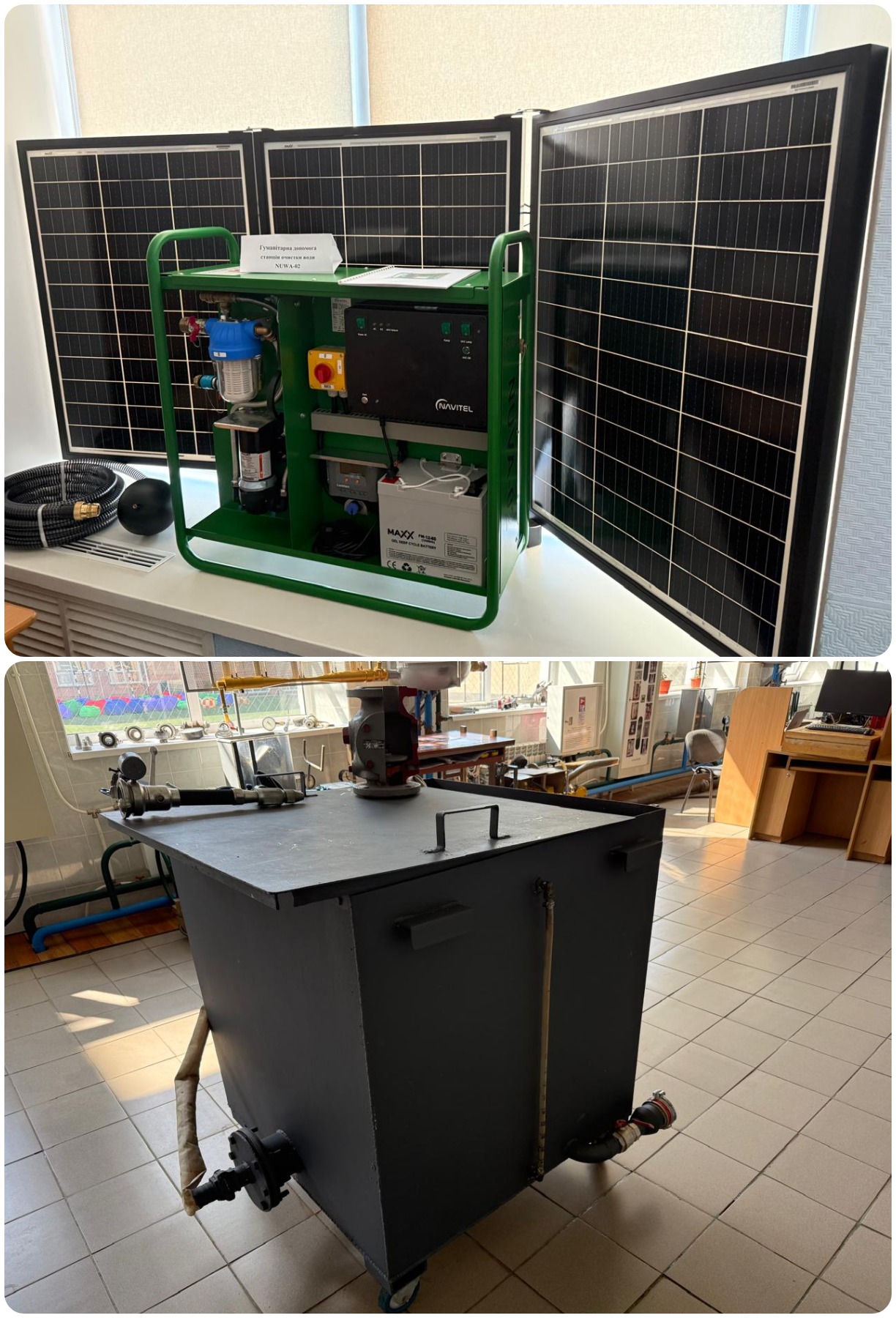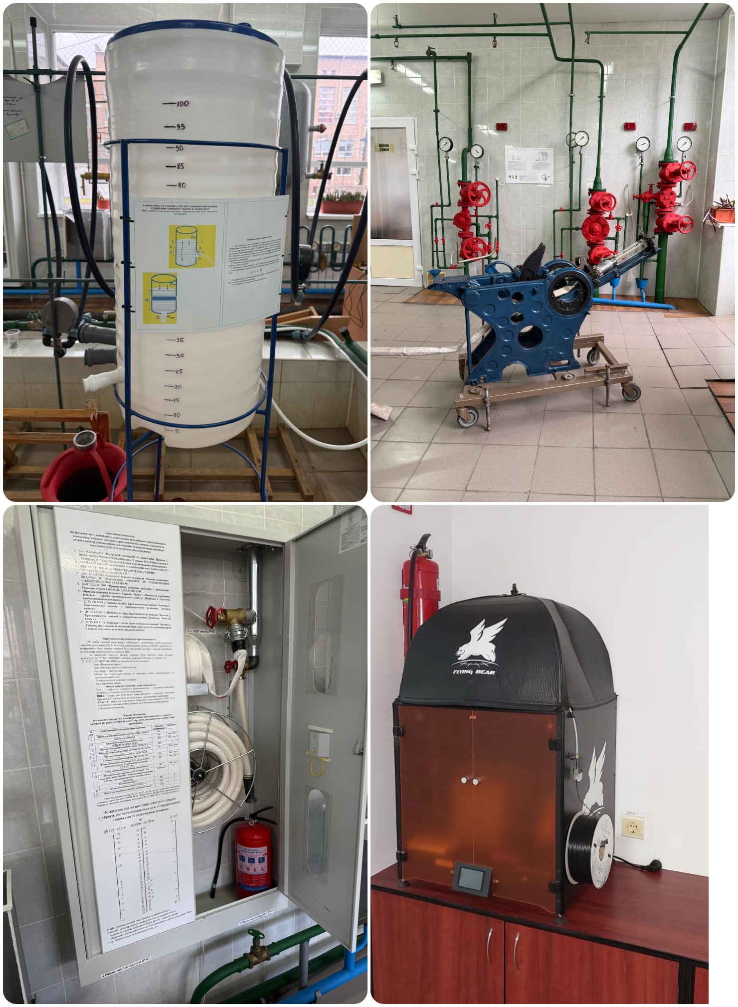 Лабораторія «Протипожежне водопостачання» призначений для проведення практичних та семінарських занять. Оснащення включає навчальні стенди з трубопроводами різних діаметрів і матеріалів, насосні агрегати з частотним регулюванням, запірно-регулювальну арматуру, витратоміри та манометри, моделі резервуарів і гідравлічних баків. Лабораторія придатна до виконання курсових/кваліфікаційних робіт, проведення прикладних досліджень, що формує у здобувачів вищої освіти практичні компетентності з експлуатації та модернізації сучасних систем протипожежного водопостачання.