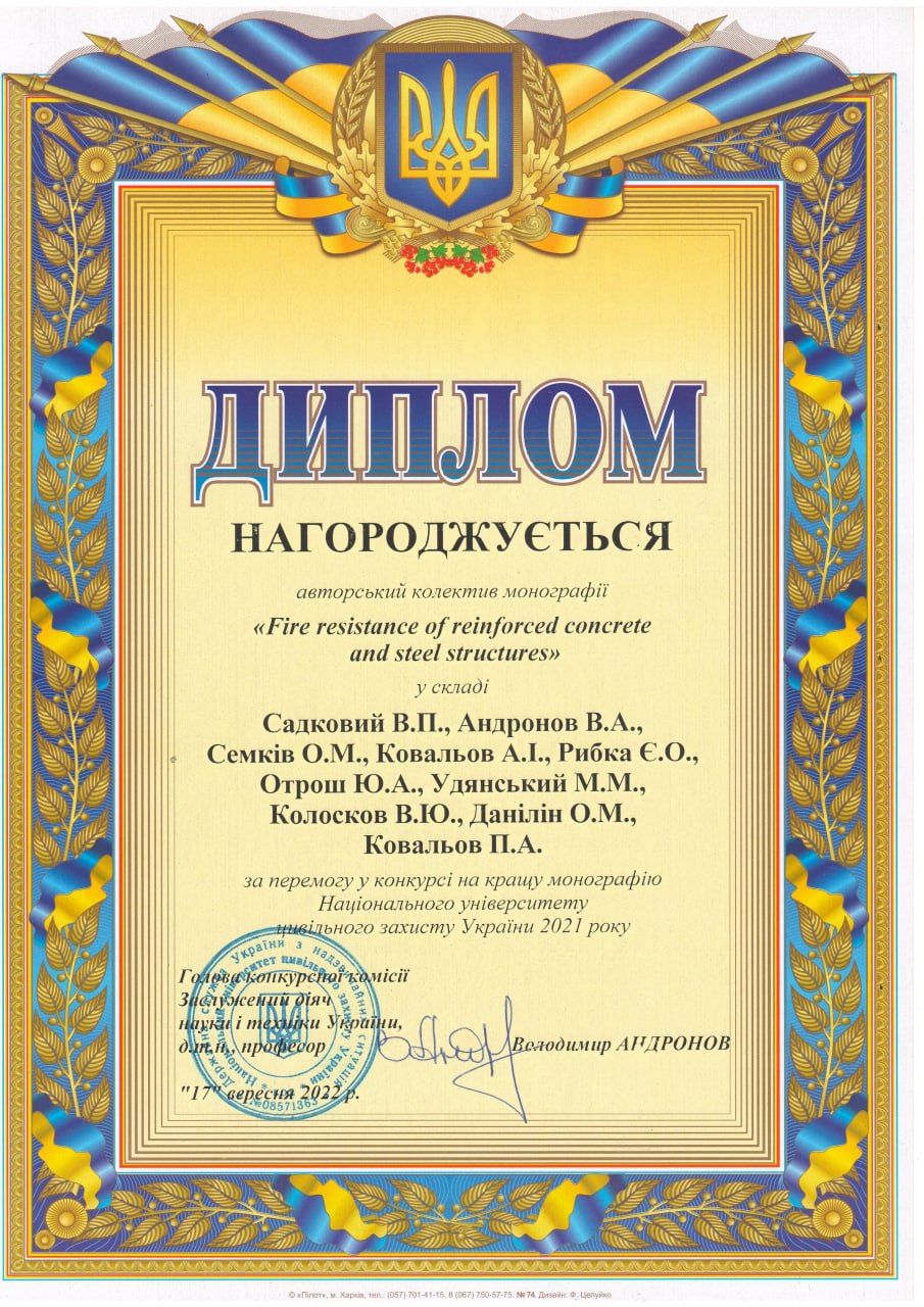 Садковий В.П. Вогнестійкість залізобетонних та сталевих конструкцій: монографія / В.П. Садковий , В.А. Андронов, О.М. Семків, А.І. Ковальов, Є.О. Рибка, Ю.А. Отрош, М.М. Удянський, В.Ю. Колосков, О.М. Данілін, П.А. Ковальов.