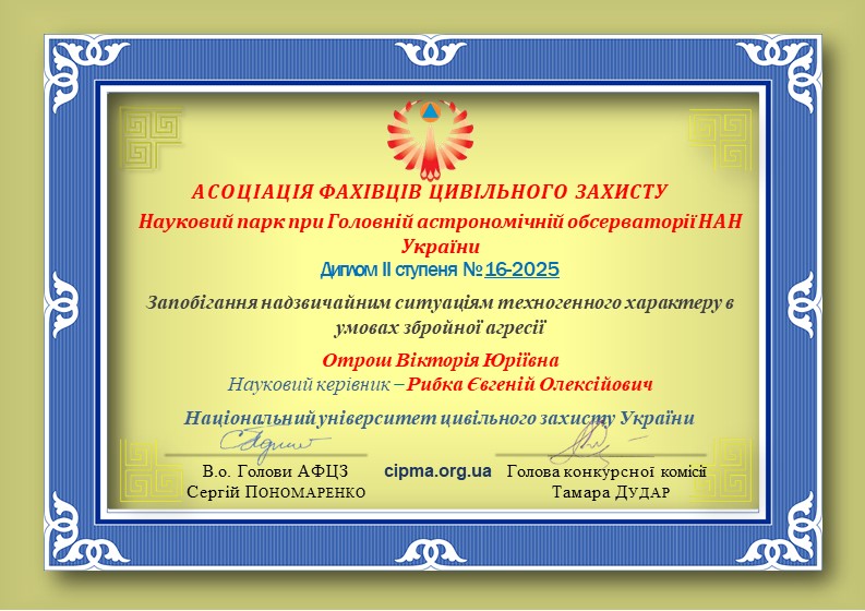 - Отрош В.Ю. - призове місце, диплом ІІ ступеня "Запобігання надзвичайним ситуаціям техногенного характеру в умовах збройної агресії", 2025 рік.