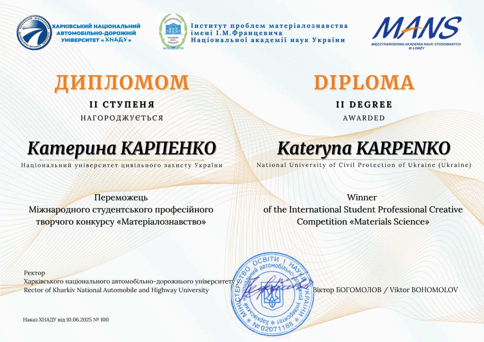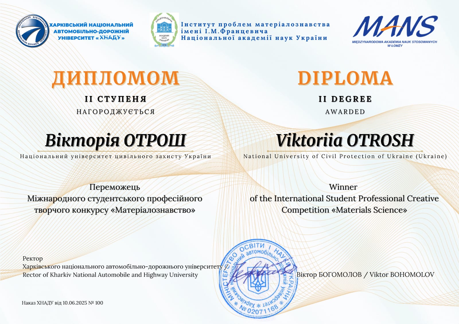 - Отрош В.Ю., Карпенко К.М. - переможці Міжнародного студенського професійного творчого конкурсу "Матеріалознавство". Диплом ІІ ступеня, 2025 рік.