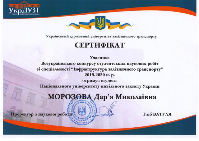 - Мельнік Д.І., Бондаренко А.А. – призове місце на I етапі Всеукраїнського конкурсу студентських наукових робіт 2021 р. (наказ НУЦЗУ № 72 від 13.04.2021 р., додаток 3 п. 15).