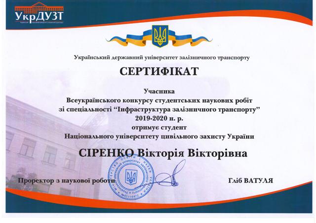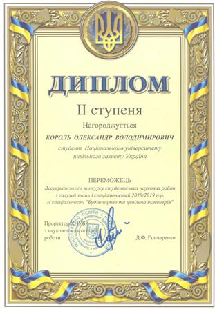 - Оксьом Т.Ю., Мироненко А.А. – призове місце на I етапі Всеукраїнського конкурсу студентських наукових робіт 2021 р. (наказ НУЦЗУ № 72 від 13.04.2021 р., додаток 3 п. 26).