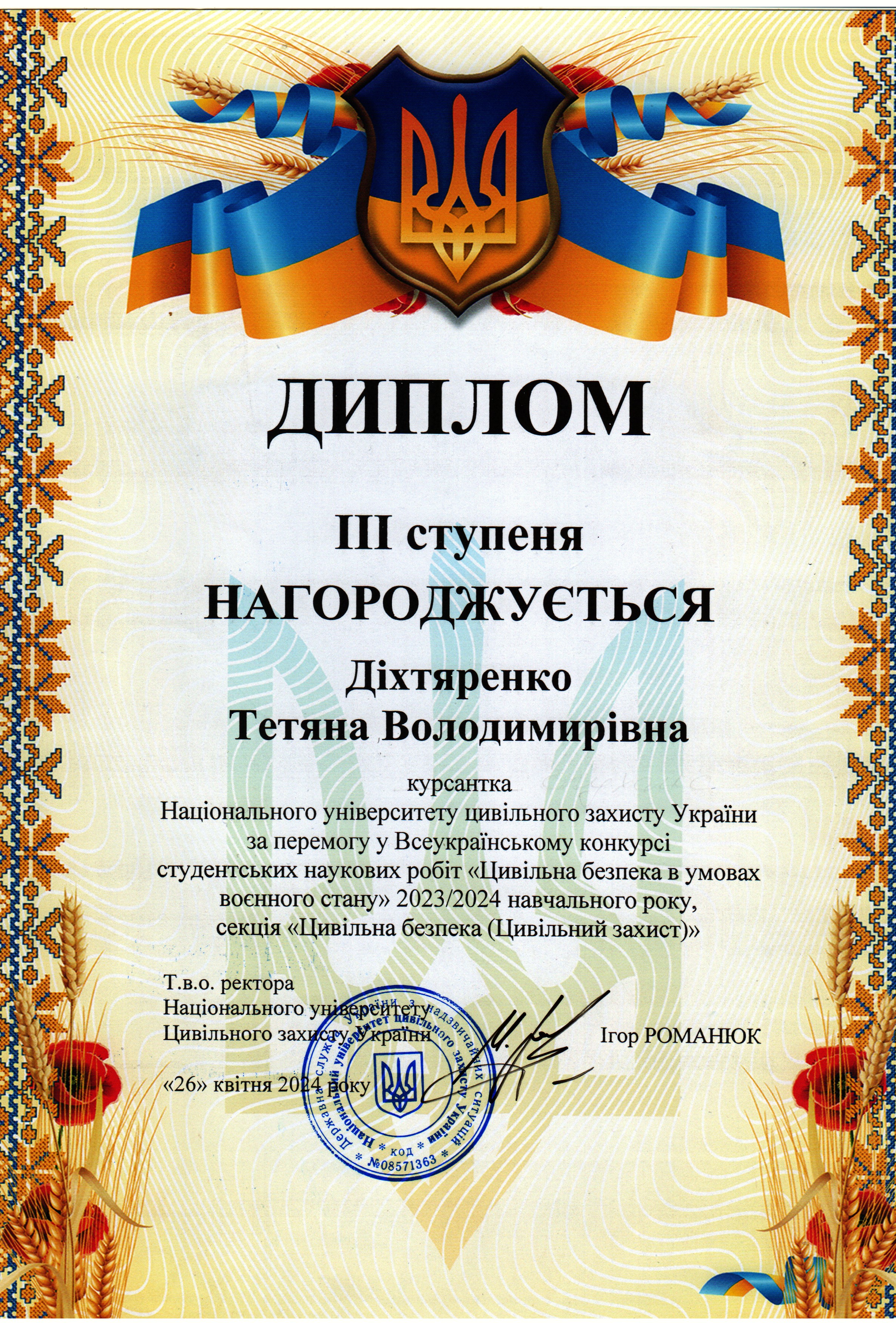 - Козлов А.О., Діхтяренко Т.В. – призове місце на IІ етапі Всеукраїнського конкурсу студентських наукових робіт у 2023/2024 навчальному році, «Цивільна безпека в умовах воєнного стану», секція «Цивільна безпека (Цивільний захист)». Диплом ІІІ ступеня.