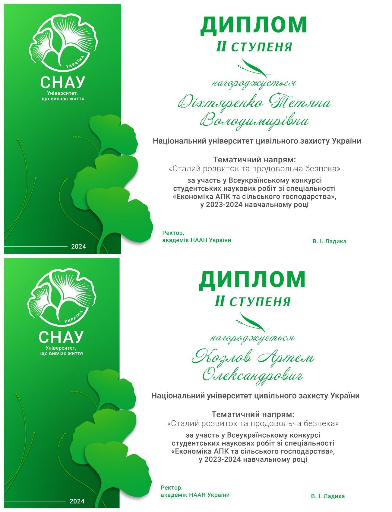 - Козлов А.О., Діхтяренко Т.В. – призове місце на IІ етапі Всеукраїнського конкурсу студентських наукових робіт у 2023/2024 навчальному році, тематичний напрям «Сталий розвиток та продовольча безпека» зі спеціальності «Економіка АПК та сільського господарства». Диплом ІІ ступеня.