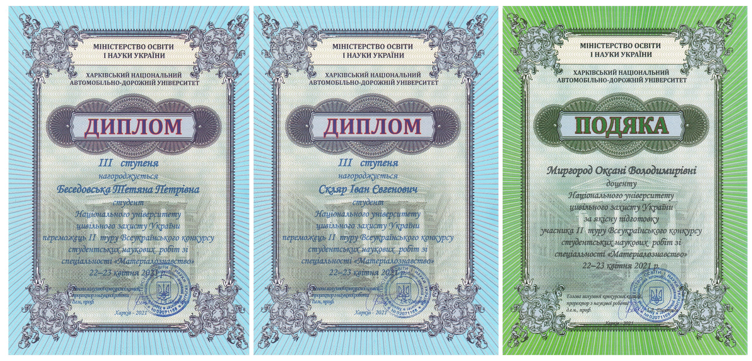 - Скляр І.Є., Беседовська Т.П. – призове місце на ІІ етапі Всеукраїнського конкурсу студентських наукових робіт з природничих, технічних і гуманітарних наук з галузі «Матеріалознавство» 2021 р. Дипломи ІІІ ступеню.
