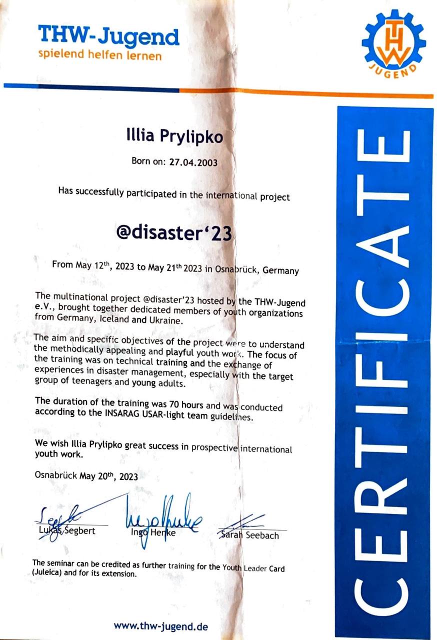 З 10 по 23 травня 2023 року у м. Оснабрюк (Федеративна Республіка Німеччини) курсант 3-го курсу Ілля Приліпко взяв участь у практичному семінарі "disaster", який було організовано в рамках співробітництва Координаційної ради Руху "Школа безпеки" (Україна) та THW-Jugend e.V (ФРН). Під час семінару проводились навчання: з надання домедичної допомоги; порятунку постраждалих та матеріальних цінностей під завалами; транспортування потерпілих з місця, де діють небезпечні чинники; рятування осіб з колодязів за допомогою спеціальної опори "триноги", яка встановлюється над колодязем; спуску постраждалих з висоти за допомогою різного обладнання.