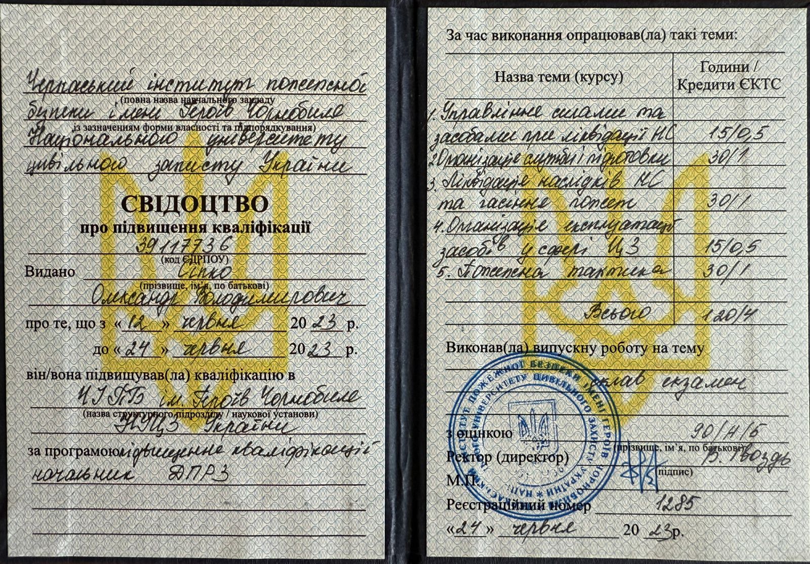 - курси підвищення кваліфікації в ЧІПБ ім.Героїв Чорнобиля НУЦЗ України за програмою «Підвищення кваліфікації начальник ДПРЗ», 2023 р. Свідоцтво про підвищення кваліфікації № 39117736;