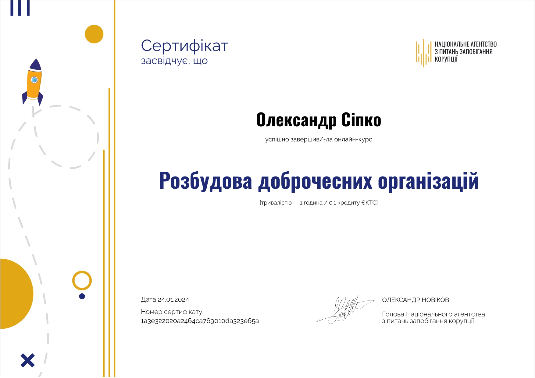 - курс «Розбудова доброчесних організацій», 2024 р. Сертифікат національного агенства з питань запобігання корупції.