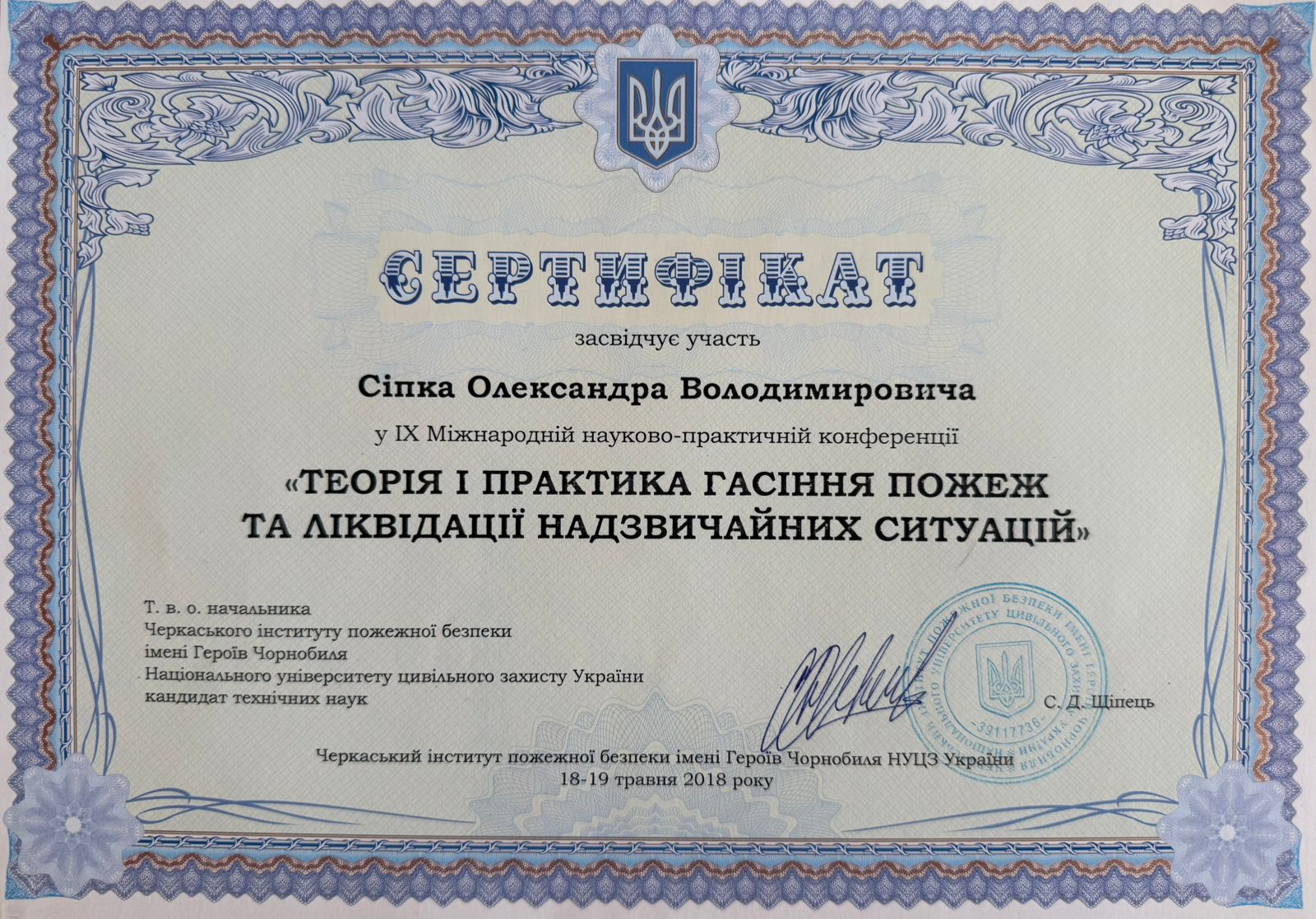 участь у ІХ Міжнародній науково-практичній конференції «Теорія практика гасіння пожеж та ліквідації надзвичайних ситуацій» на базі ЧІПБ ім. Героїв Чорнобиля НУЦЗ України, 2018 р.