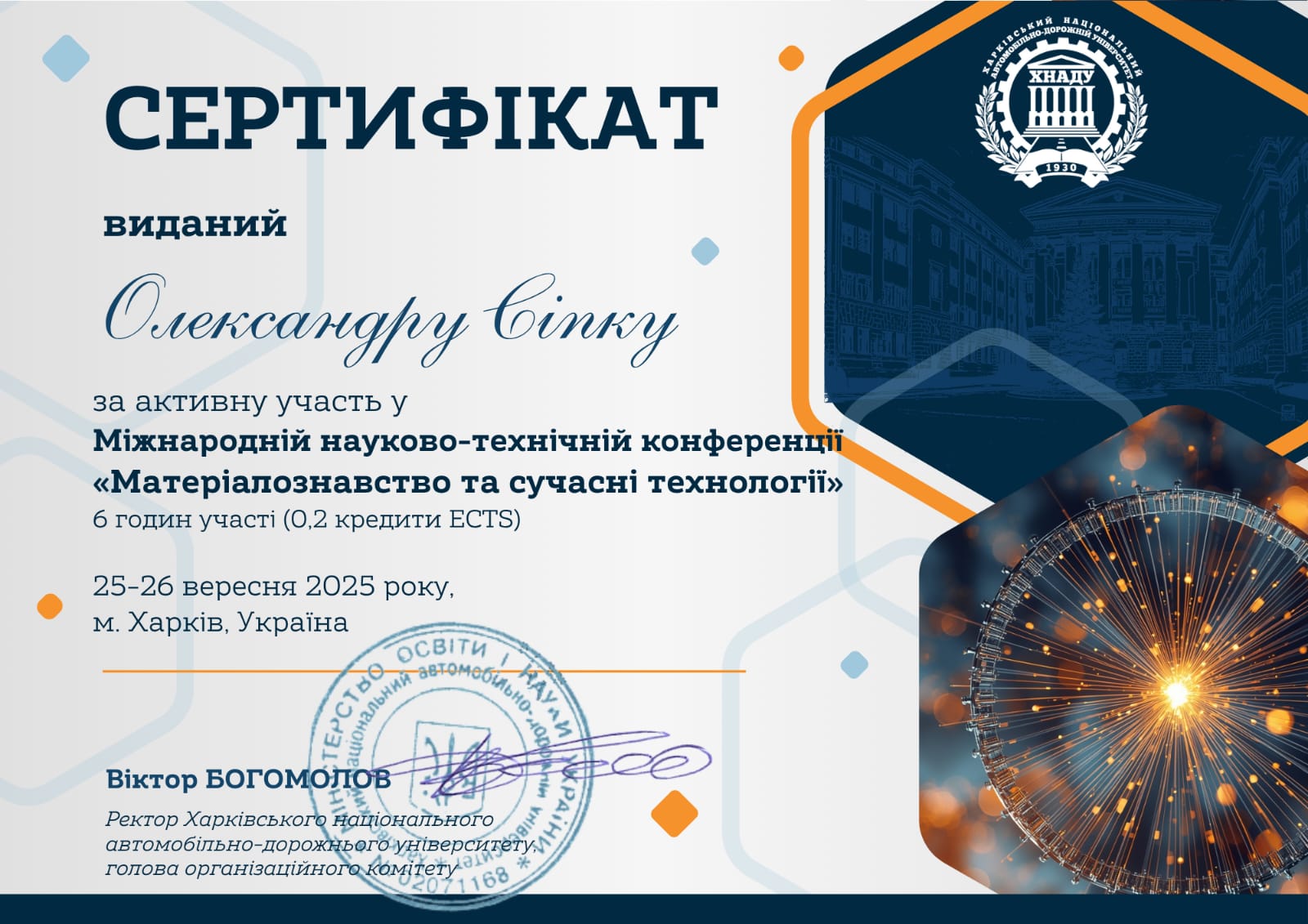 - участь у Міжнародній науково-технічній конференції «Матеріалознавство та сучасні технології» на базі ХНАДУ, 2025 р.;