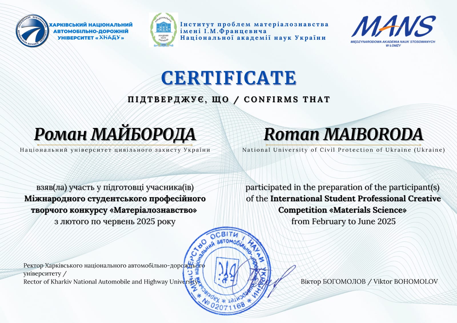 2026 р. - закінчив ад'юнктуру Національного університету цивільного захисту України, отримав освітньо-науковий ступінь доктора філософії зі спеціальності "Пожежна безпека".