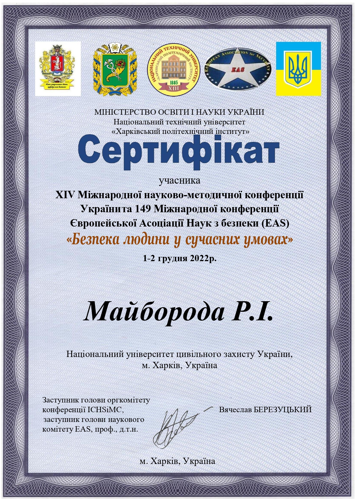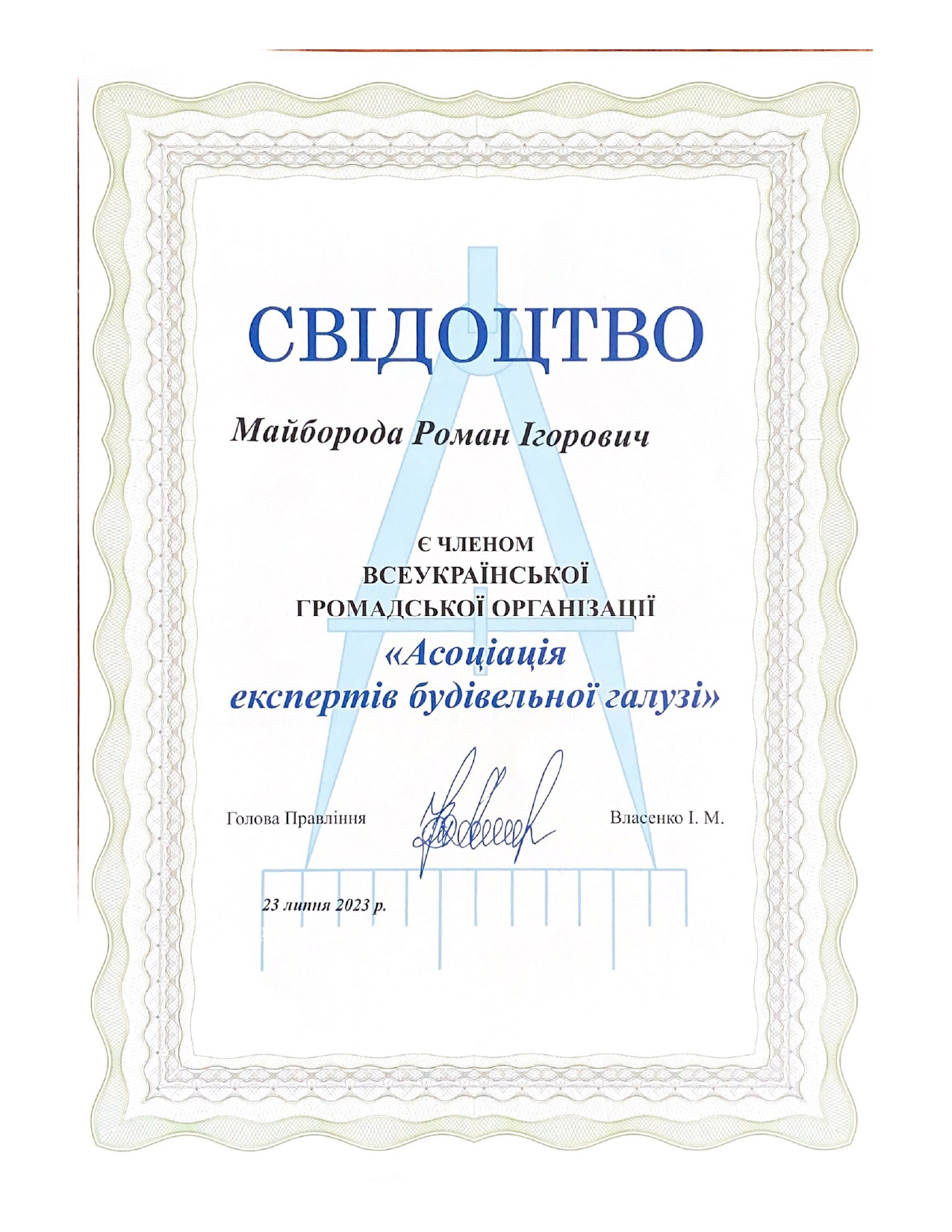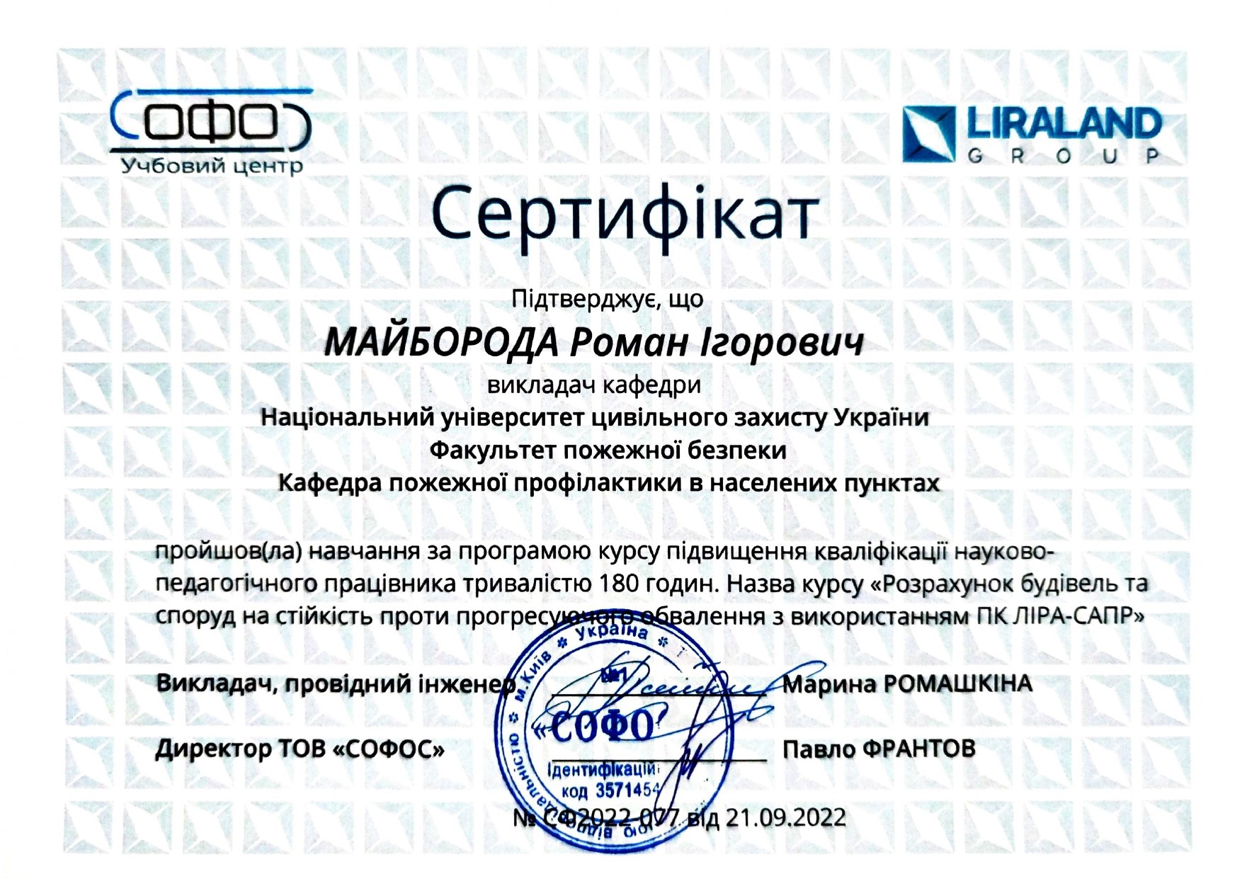 курс по практичному застосуванню програмного комплексу ЛІРА-САПР 2022 тривалістю 180 навчальних годин, вересень 2022 р. Сертифікат;