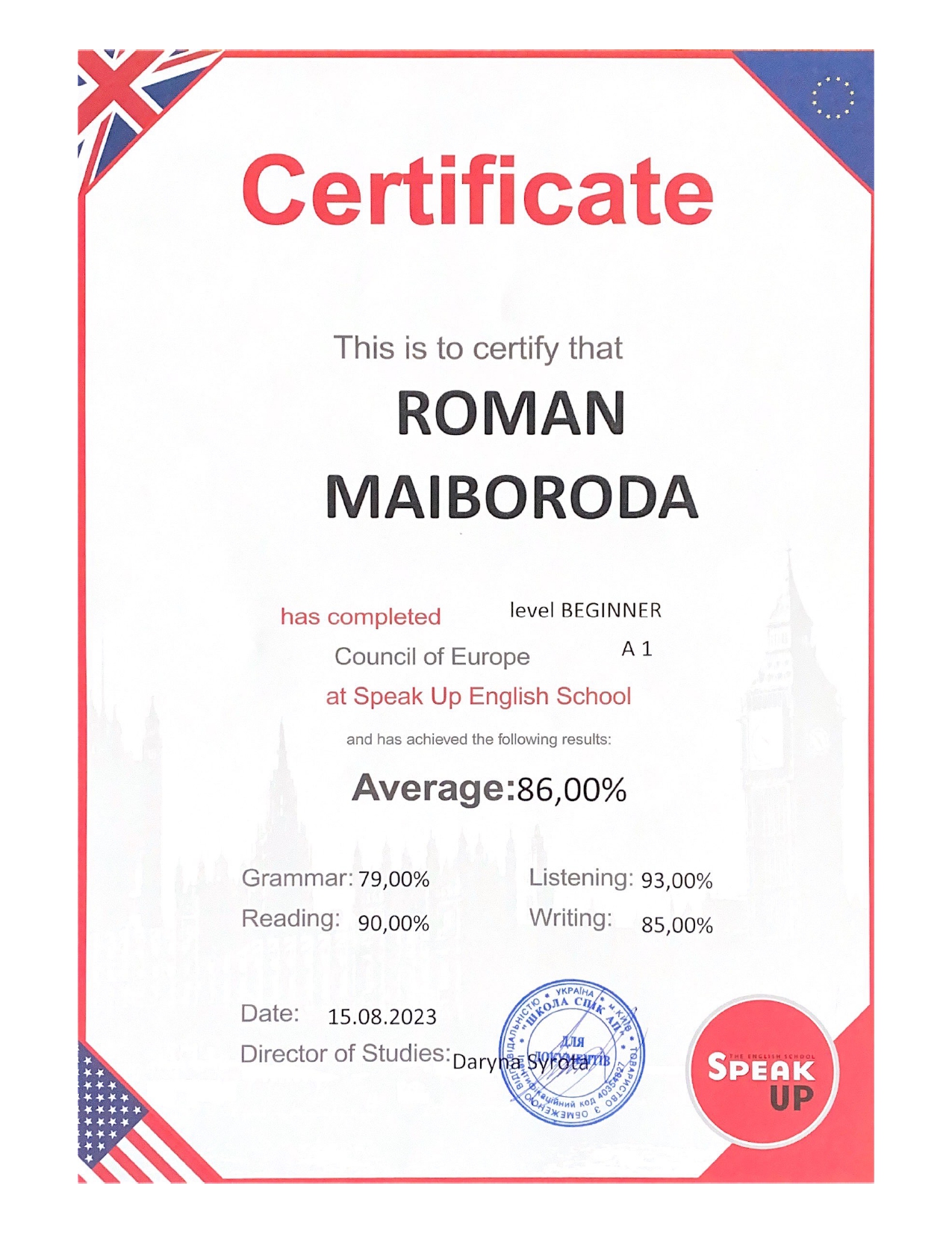 курси на рівень володіння англійською мовою, серпень-грудень 2023 р. Сертифікат;