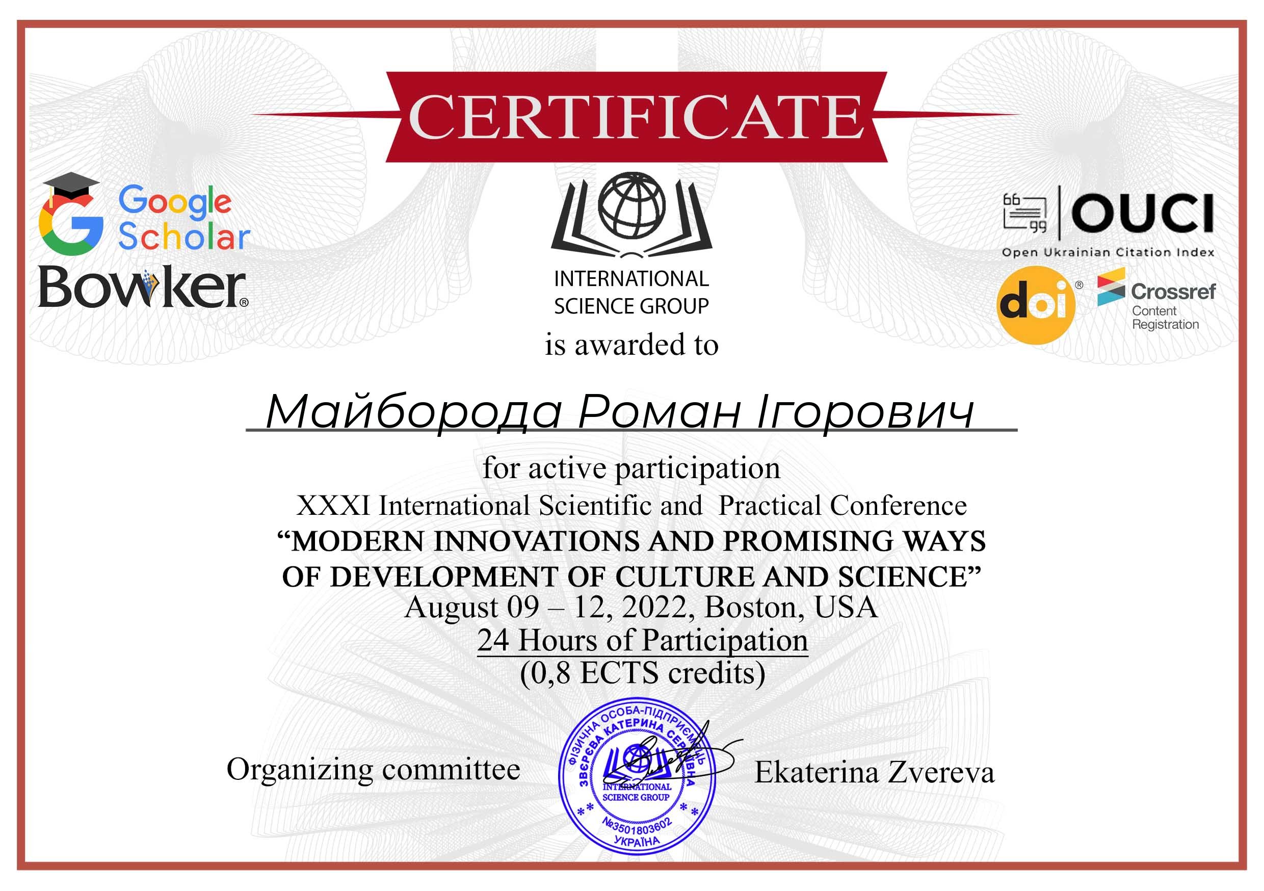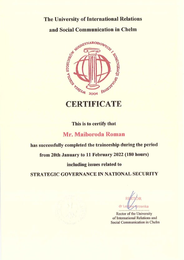 курси післядипломної освіти на базі НЕЦЗ України за ОП «Інноваційні методології в освітньому процесі підготовки фахівців для сфери цивільного захисту» (120 годин / 4 кредити), 2024 р. Сертифікат;