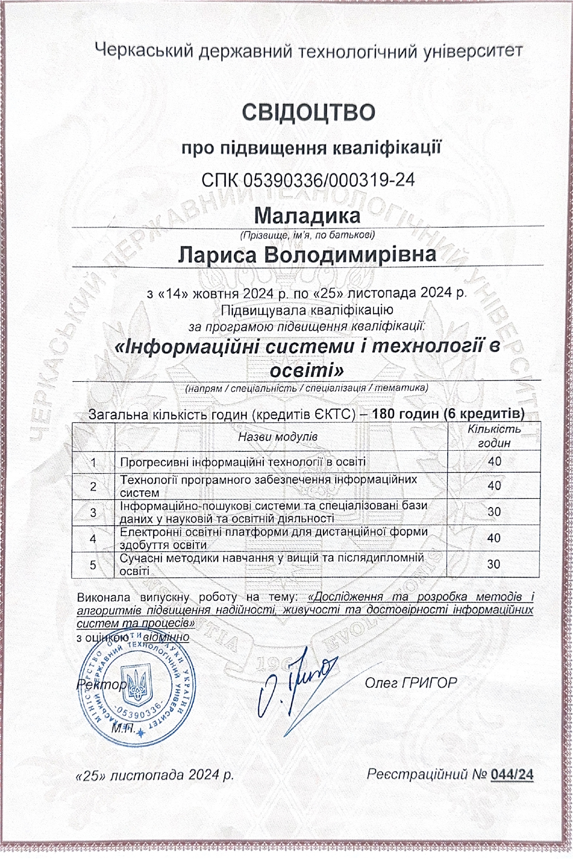 Черкаський державний технологічний університет. Свідоцтво про підвищення кваліфікації № 044/24 від 25.11.2024р. Підвищення кваліфікації за програмою «Інформаційні системи і технології в освіті», 180 год.