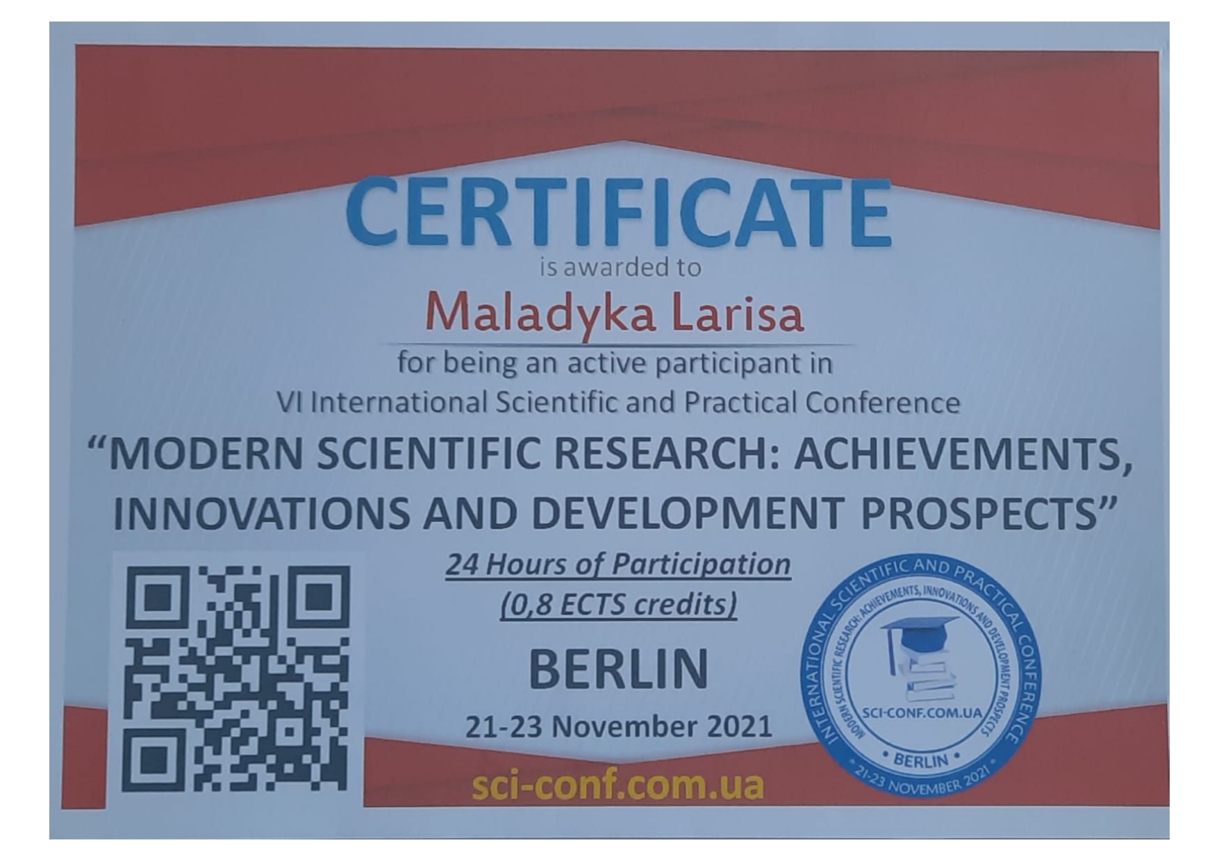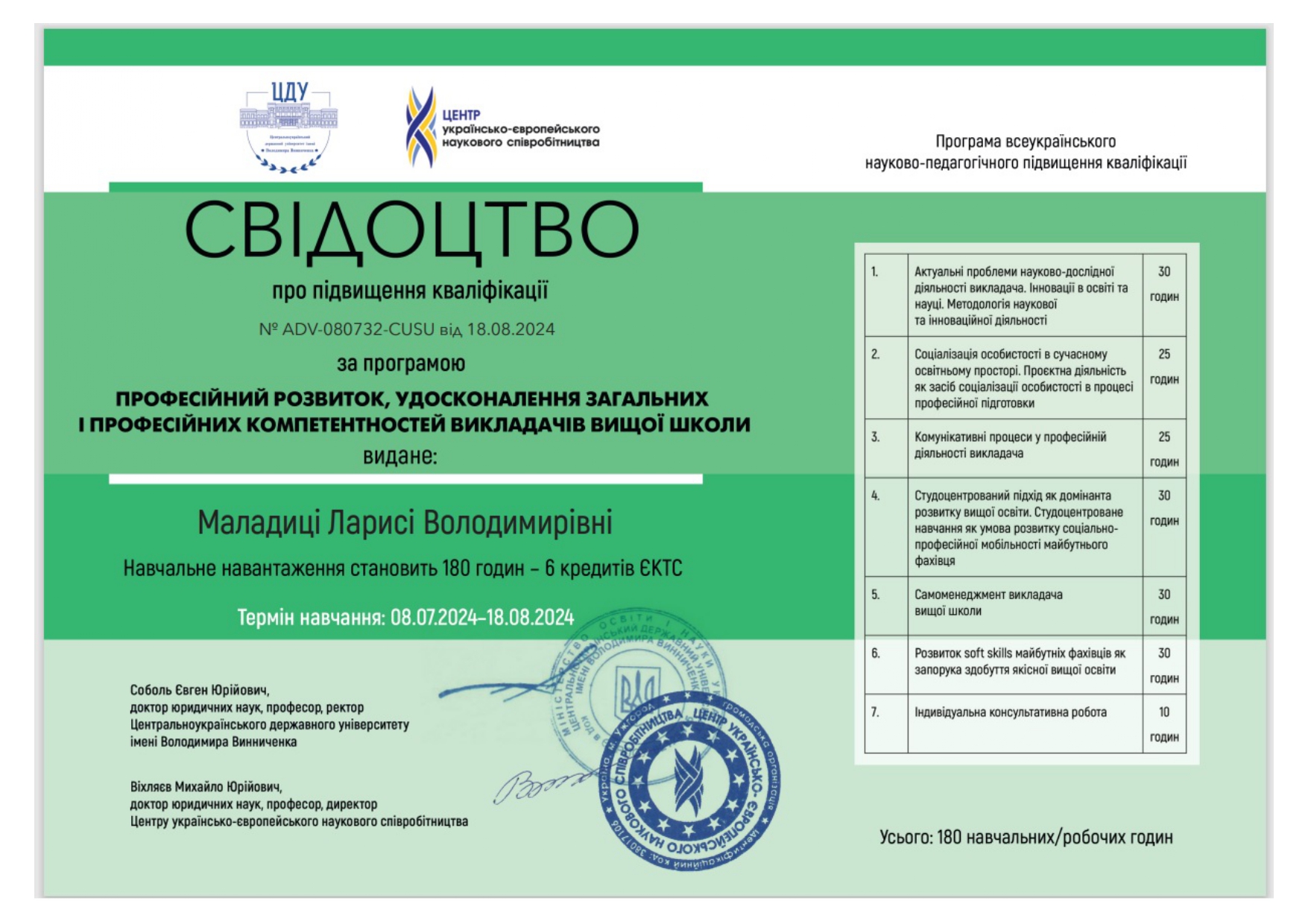 Центральноукраїнський державний університет імені Володимира Винниченка. Сертифікат № ADV-080732-CUSU від 18.08.2024 р. Всеукраїнське науково-педагогічне підвищення кваліфікації «Професійний розвиток, удосконалення загальних і професійних компетентностей викладачів вищої школи», 180 год.