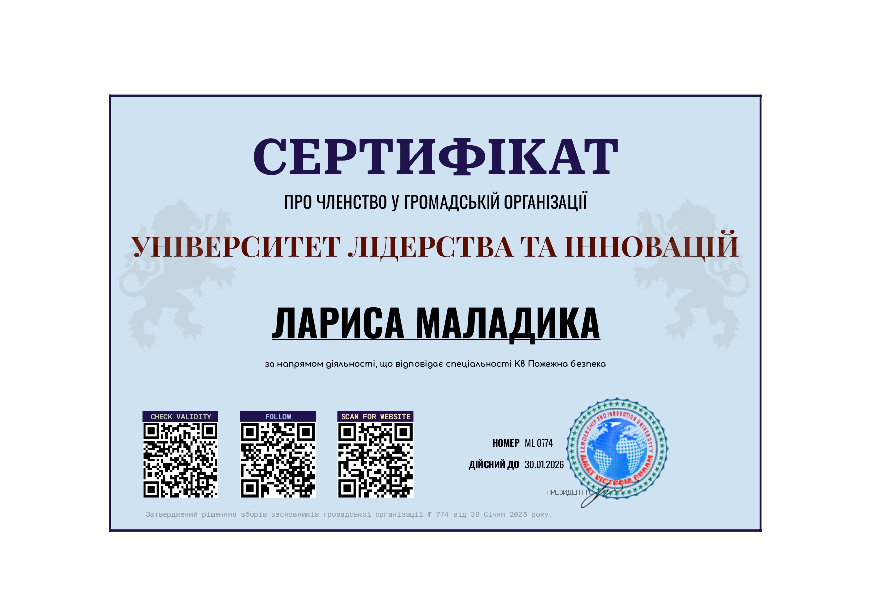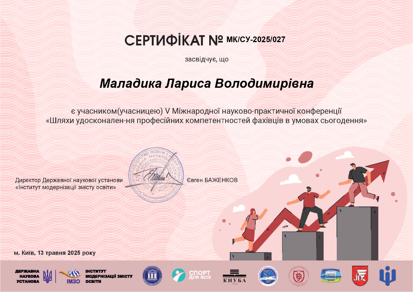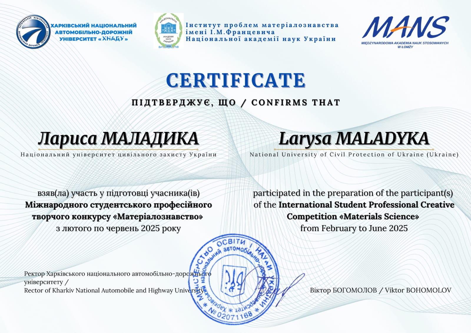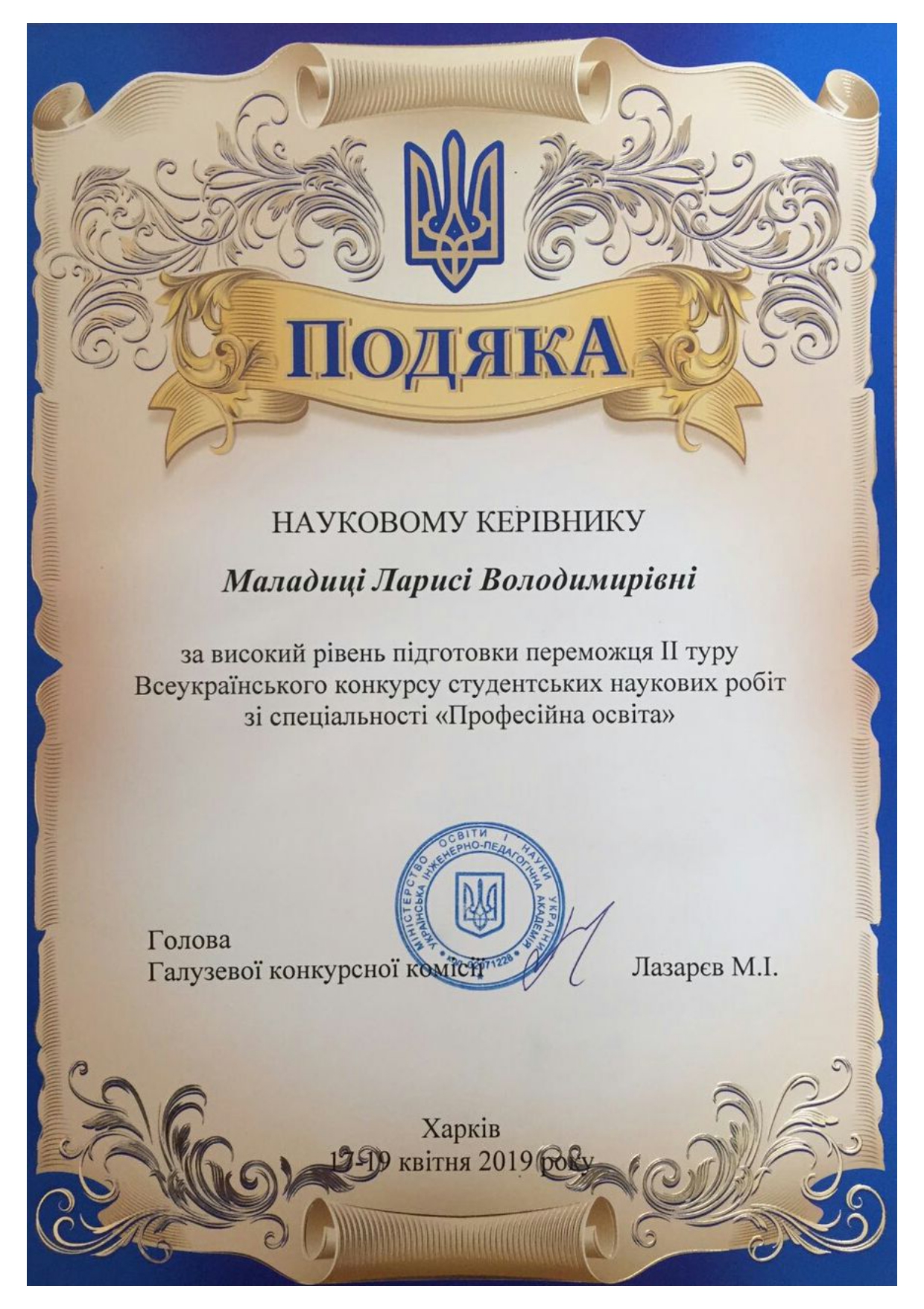 Міністерство цифрової трансформації України, Національне агентство України з питань державної служби, Національна онлайн-платформа для розвитку цифрової грамотності «Дія. Цифрова освіта», цифрові онлайн-сертифікати «Цифрова грамотність державних службовців», «Доступ до публічної інформації», «Відкриті дані для державних службовців», «Основи кібергігієни», «Кіберняні», (з 10.05.2021 р. по 18.05.2021 р.), загальним обсягом 1,03 кредиту ЄКТС