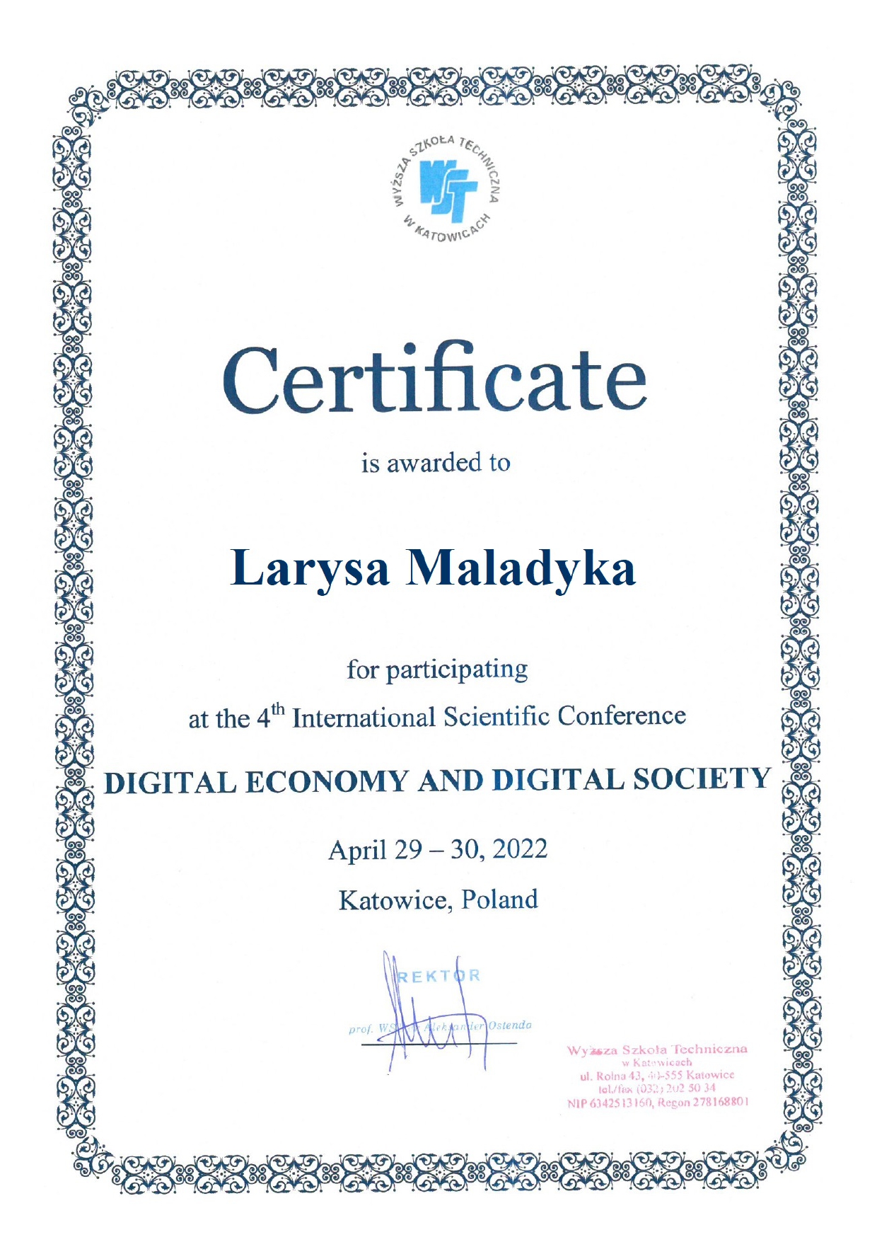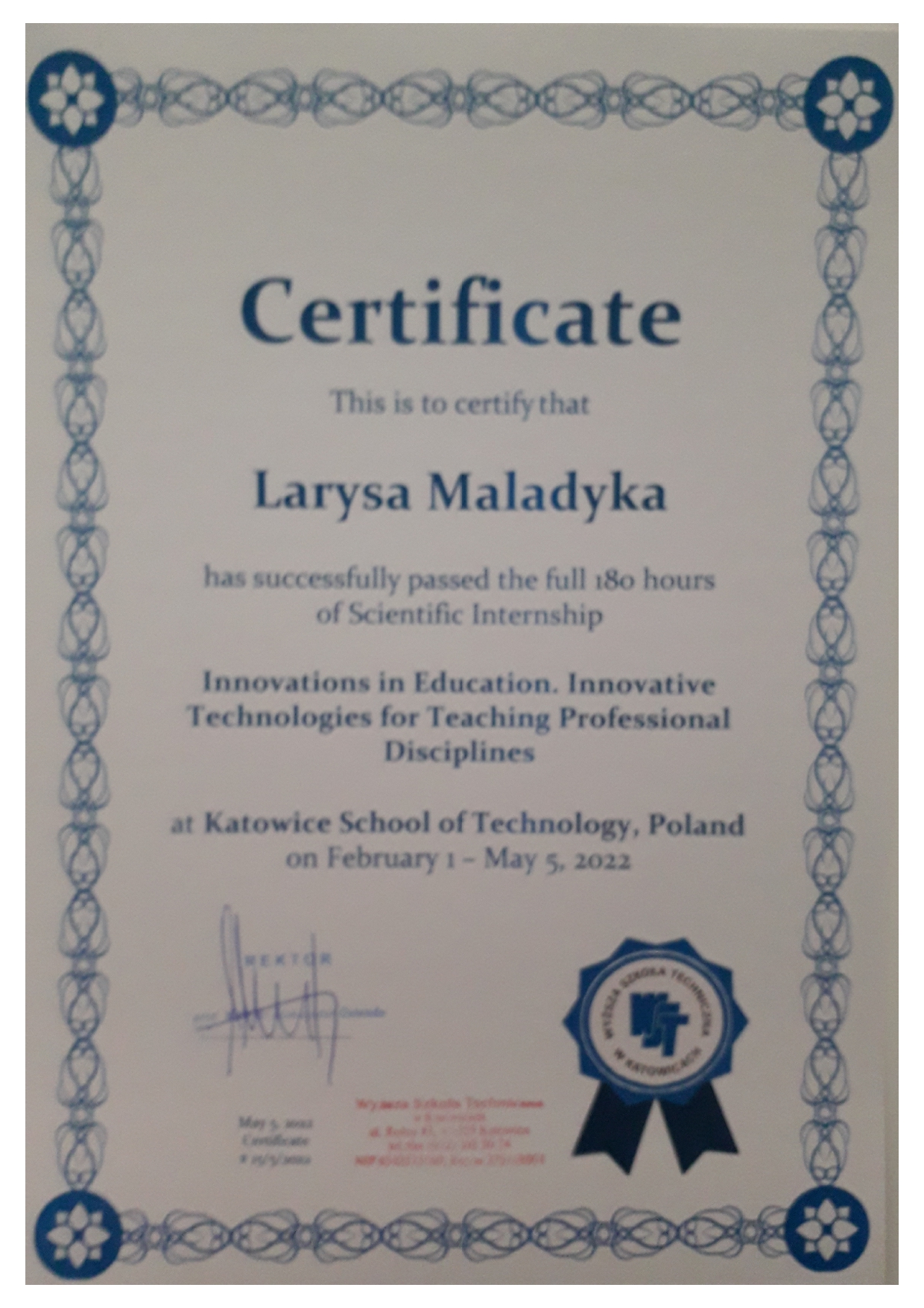 Вища технічна школа в Катовіце (WST), Республіка Польща, сертифікат «Інновації в освіті. Інноваційні технології викладання фахових дисциплін» (1 лютого – 5 травня 2022 р.), 180 год.