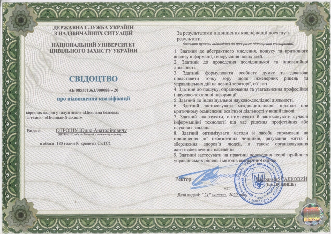 курс навчання з підвищення кваліфікації керівних кадрів у галузі знань "Цивільна безпека" за темою "Цивільний захист" у Національному університеті цивільного захисту України, лютий 2020 р. Свідоцтво.