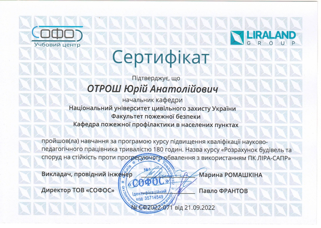 курс по практичному застосуванню програмного комплексу ЛІРА-САПР 2022 тривалістю 180 навчальних годин, вересень 2022 р. Свідоцтво;