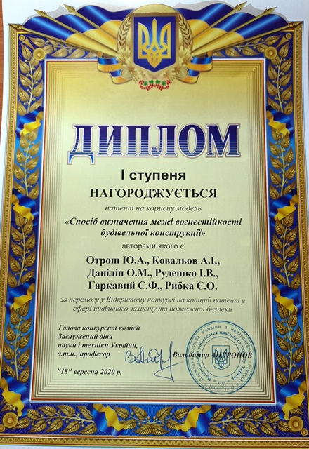 Патент на корисну модель «Спосіб визначення межі вогнестійкості будівельної конструкціЇ» № 138535. Автори розробки: Отрош Ю.А., Ковальов А.І., Данілін О.М., Рудешко І.В., Гаркавий С.Ф., Рибка Є.О., Публікація відомостей про видачу патенту: 25.11.2019, бюл. № 22/2019.