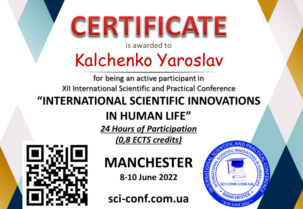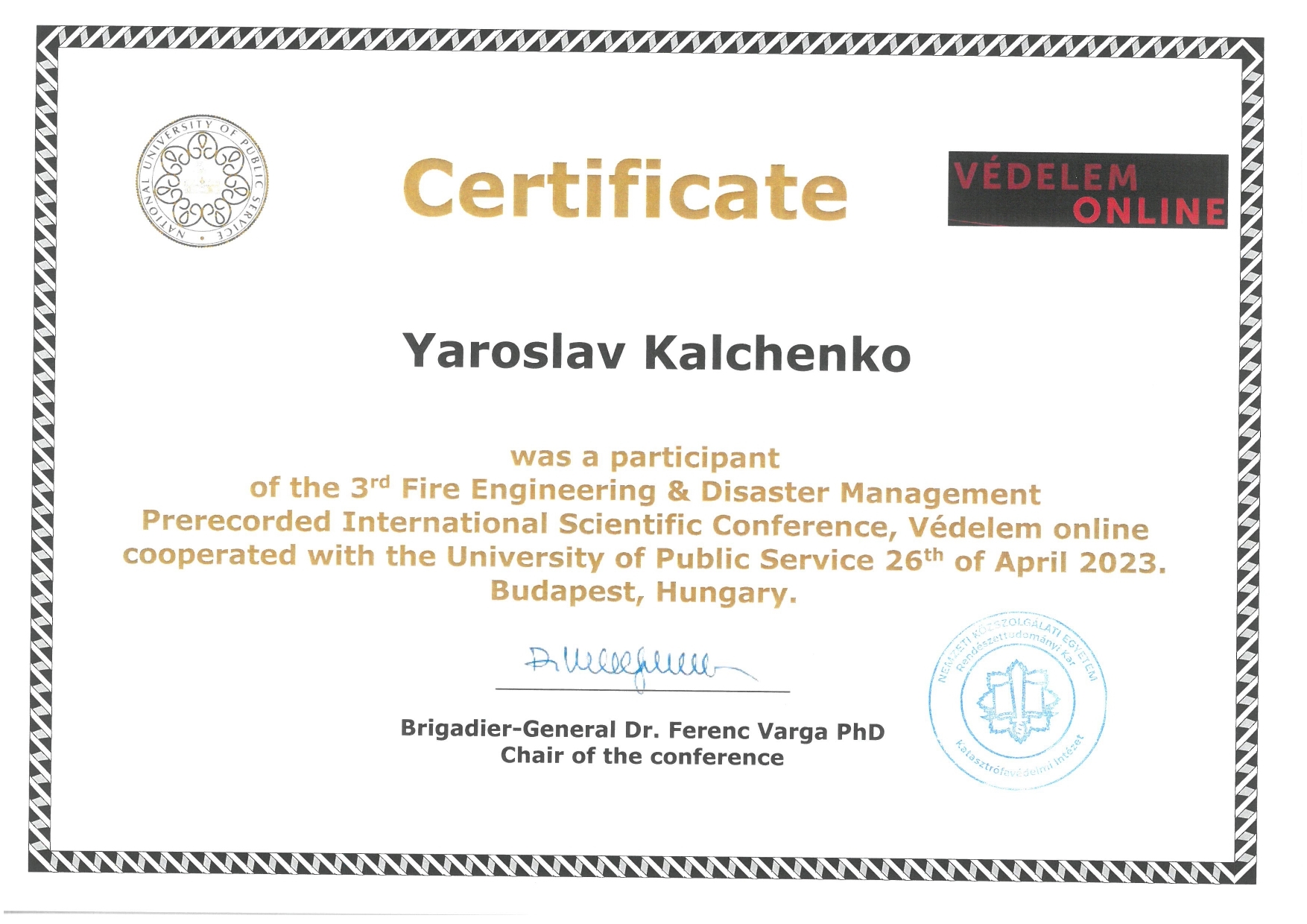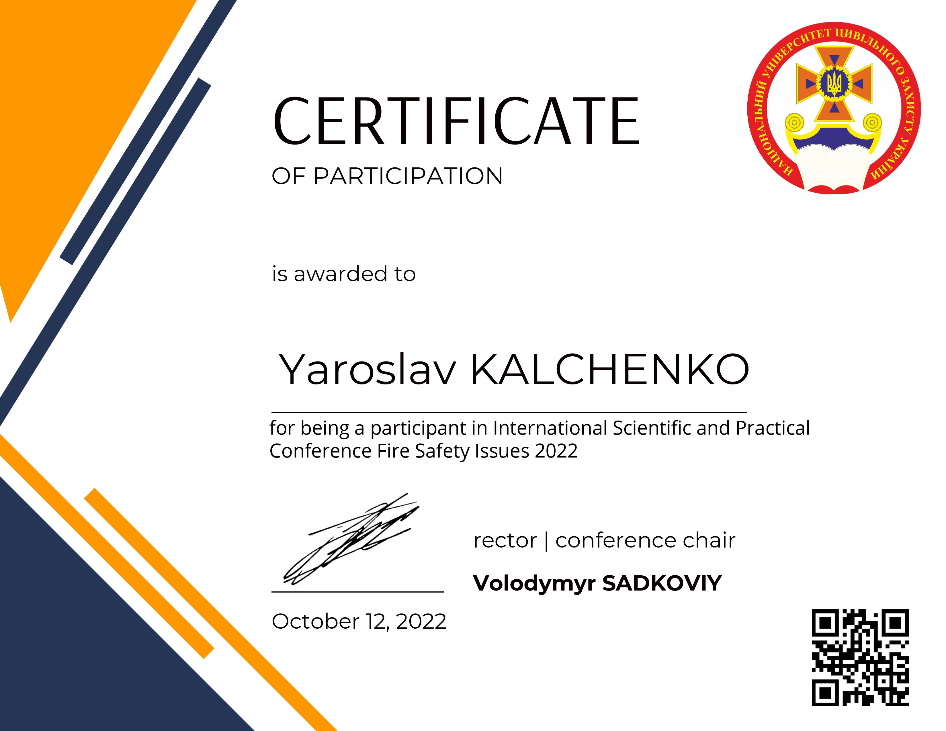 - Kalchenko Yaroslav, Istratova Diana. Analysis of thermal fire detectors system operation // The 12th International scientific and practical conference “International scientific innovations in human life” (June 8-10, 2022) Cognum Publishing House, Manchester, United Kingdom. 2022. 214 p.