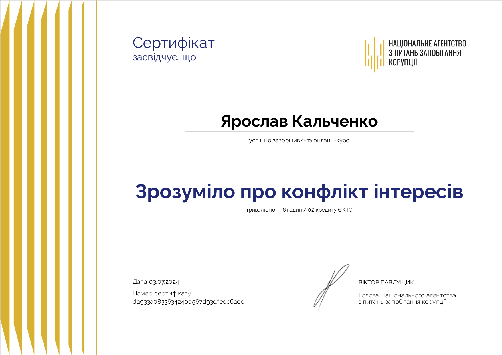 - Керівництво курсантом, який зайняв призове місце на I етапі Всеукраїнської студентської олімпіади з професійно-орієнтованих дисциплін: Електротехніка та безпека електроустановок – Павленко М.О. 2 курс – 3 місце 2023 рік.