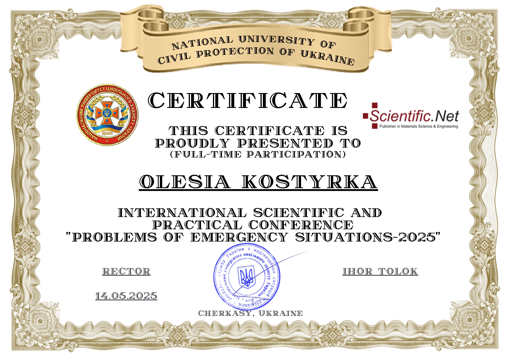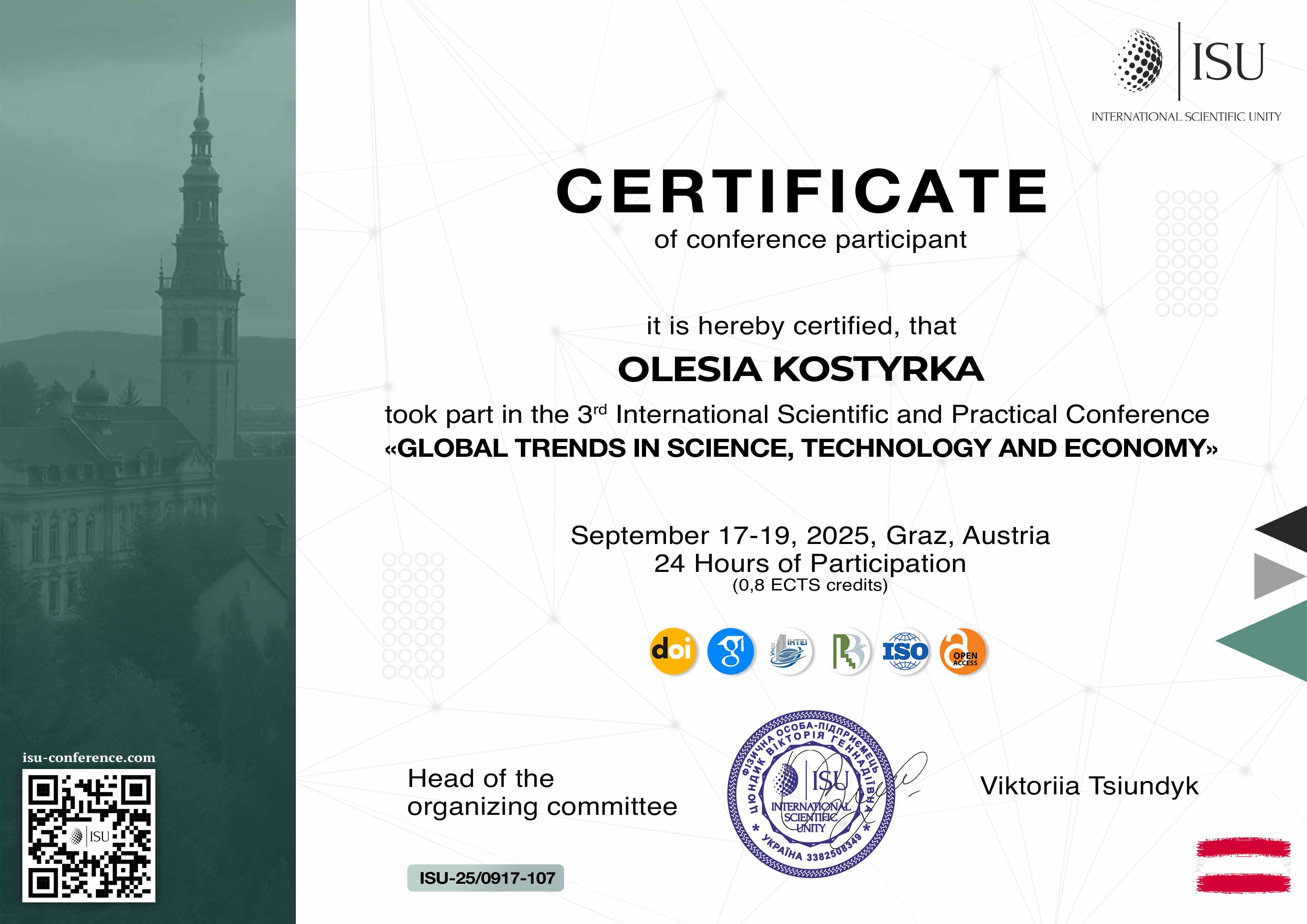 - Kostyrka Olesia, Borsuk Olena. Digitalization and automation in occupational safety under martial law in ukraine. 3-тя Міжнародна науково-практична конференція «Global Trends in Science, Technology and Economy», Graz, Austria, September 17-19, 2025, С.165-168.