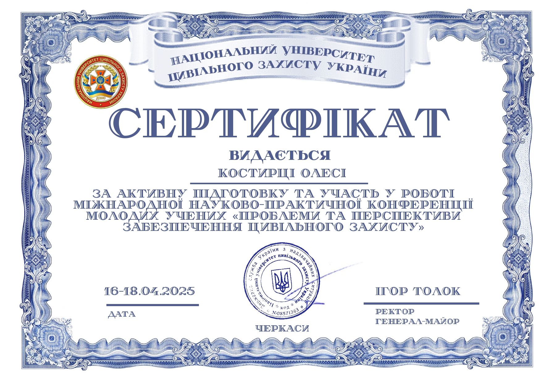 - Костирка О.В., Письменський О.П.Підвищення ефективності евакуації в разі пожежі у закладах дошкільної світи. Міжнародна науково-практична конференція молодих учених «Проблеми та перспективи забезпечення цивільного захисту» – Черкаси: НУЦЗ України, 2025. – С. 224.