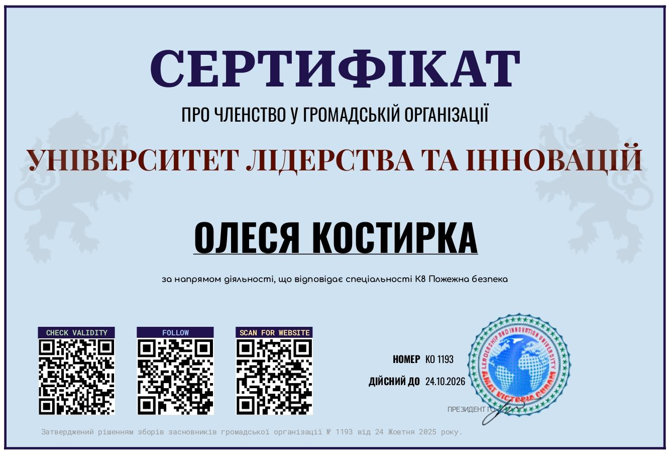 Університет лідерства та інновацій, за напрямом діяльності, що відповідає спеціальності К8 Пожежна безпека, номер KO 1193.