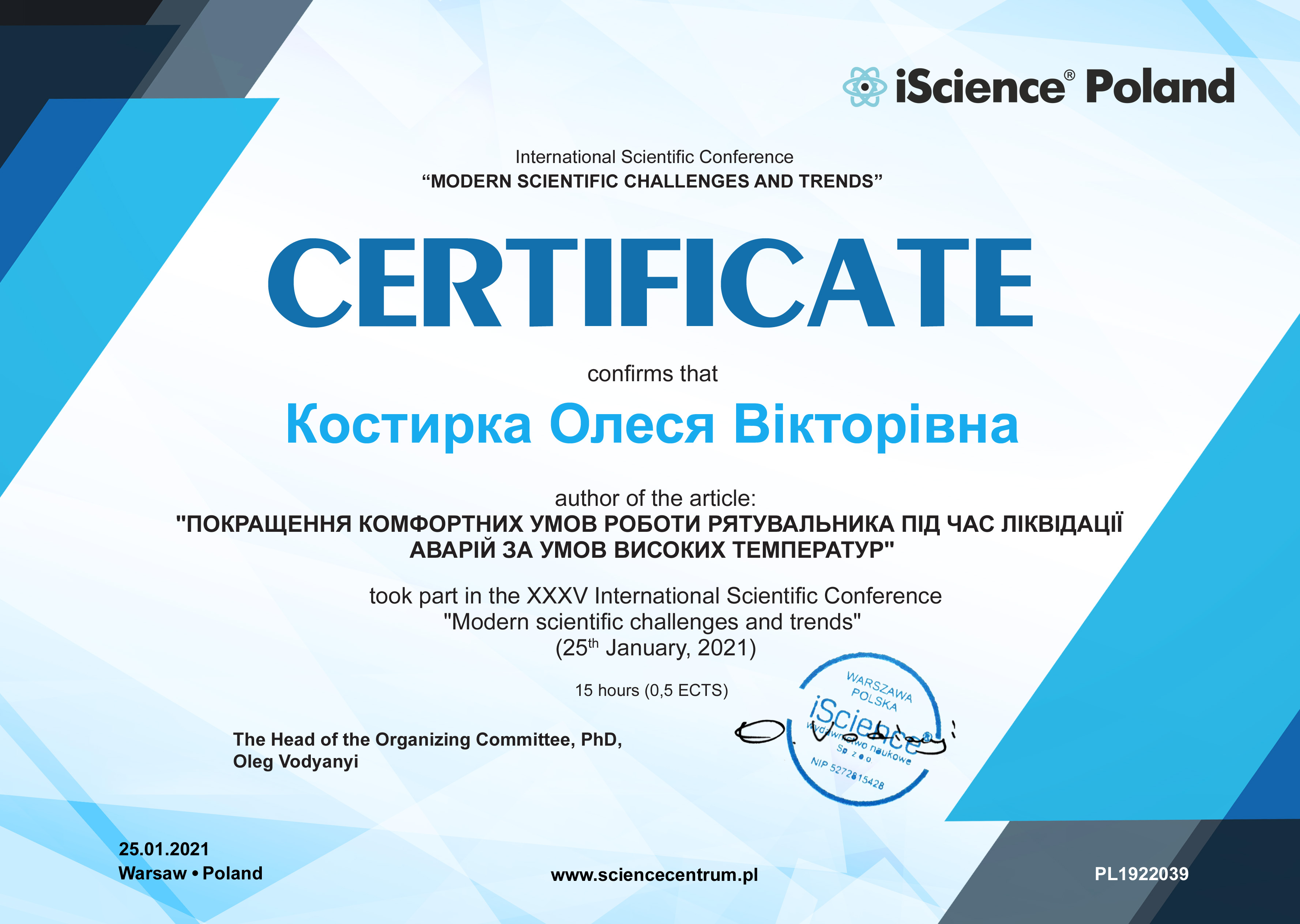 - Костирка О.В., Костенко Т.В. Покращення комфортних умов роботи рятувальника під час ліквідації аварій за умов високих температур. 35-я Международна научна конференція "Modern scientific challenges and trends". – Warsaw: Wydawnictwo Naukowe "iScience", 2021. – С. 284-289.