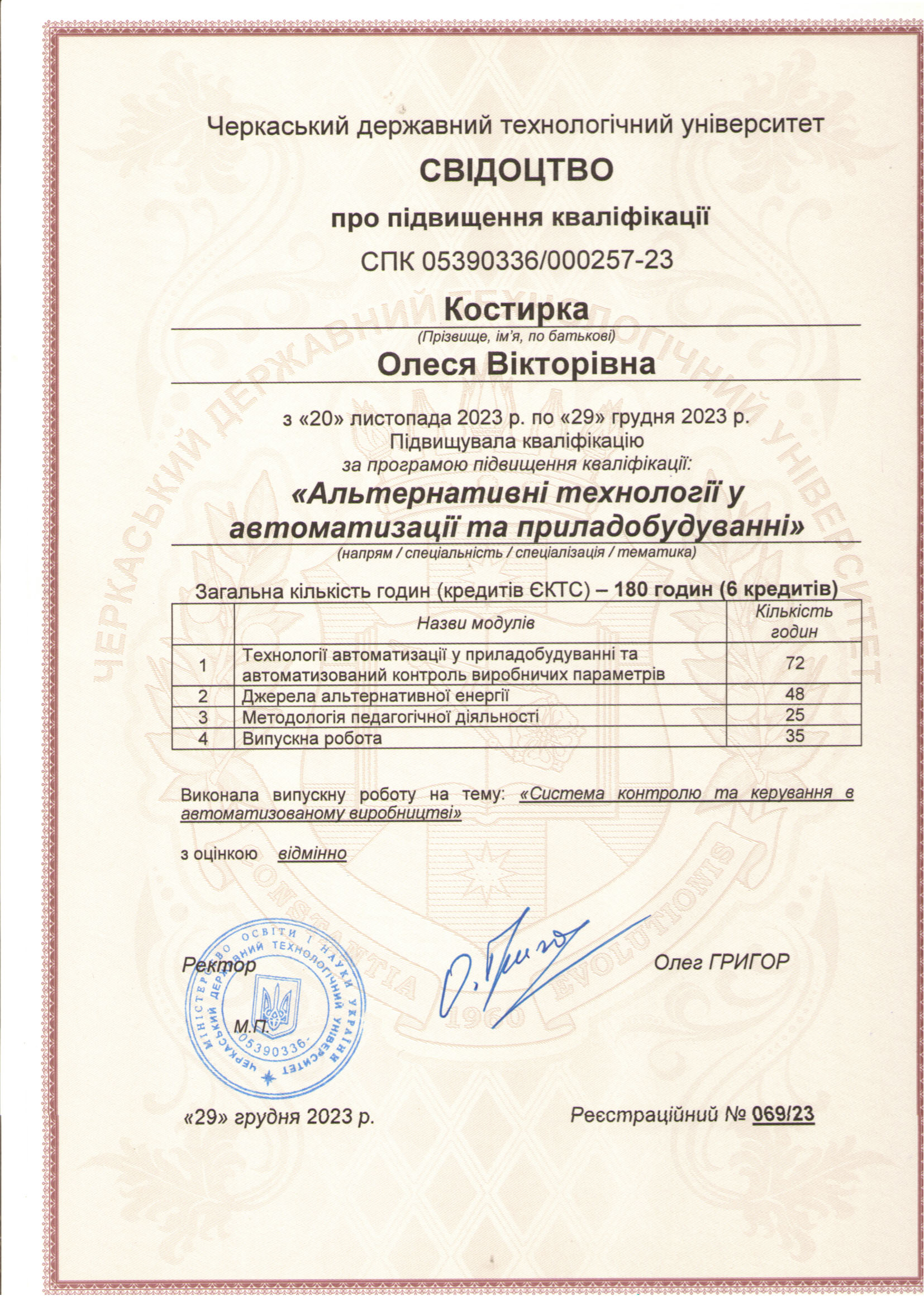 Викладаю дисципліни “Автоматика раннього виявлення надзвичайних ситуацій”, “Системи автоматичного контролю та спостереження” здобувачам освітнього рівня «бакалавр».