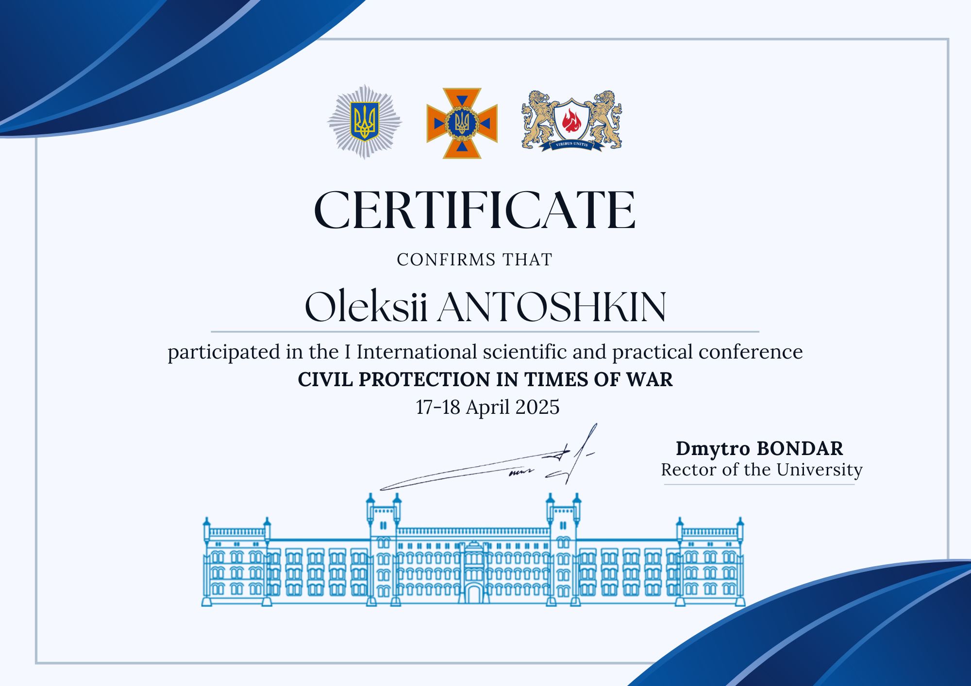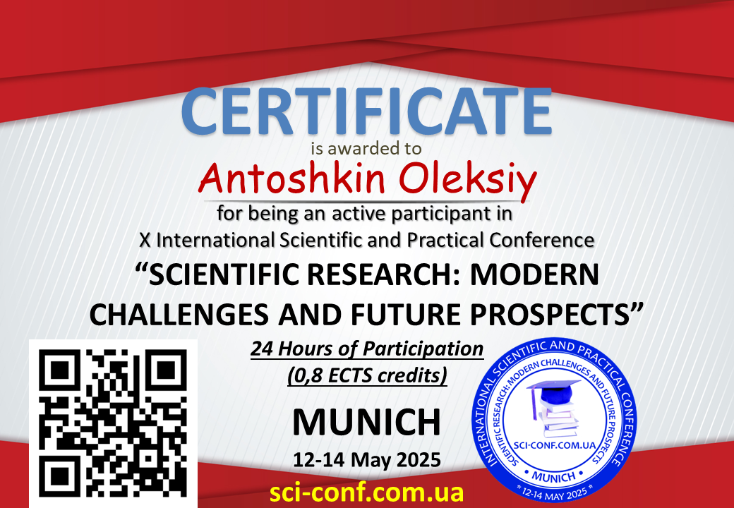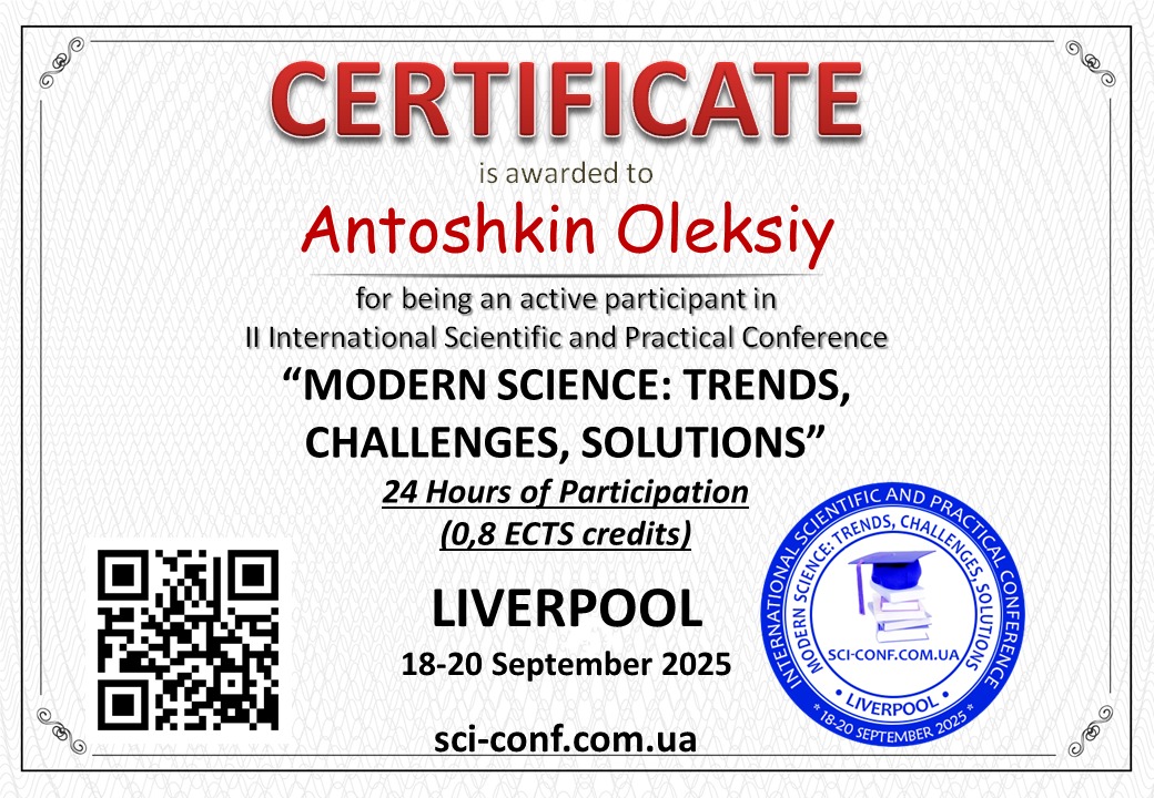 - Шатохін А.В., Антошкін О.А. Формалізація вимог до технічних рішень по покращенню протипожежного захисту приміщень з високою стелею // The 10th International scientific and practical conference “Scientific achievements of contemporary society” (May 1-3, 2025) Cognum Publishing House, London, United Kingdom. 2025. PP. 236-238